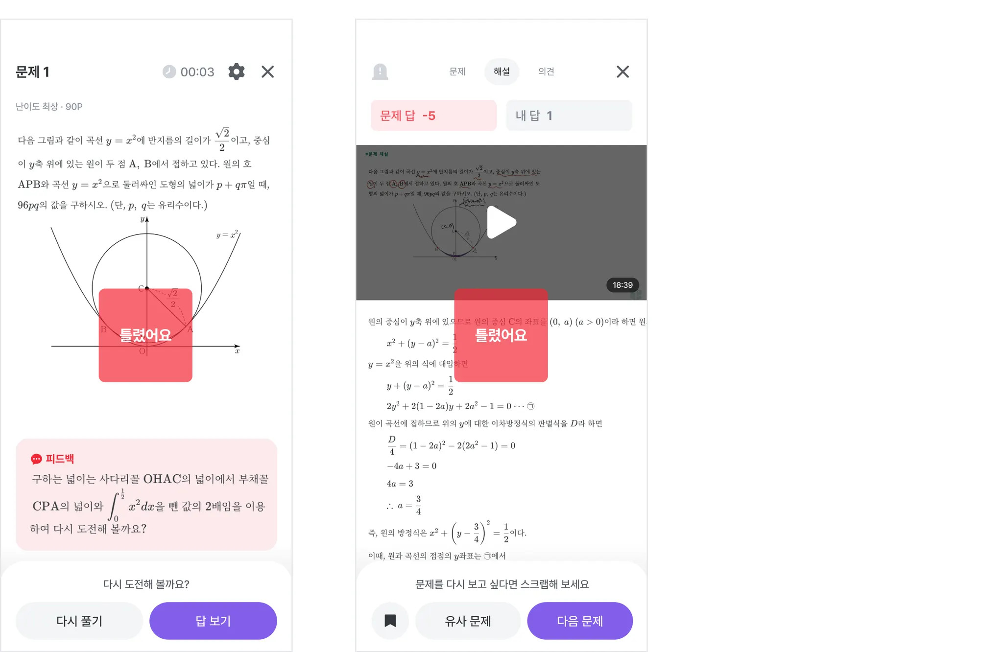 채점 후 틀렸을 때 다시 풀거나, 해설을 확인할 수 있어요.