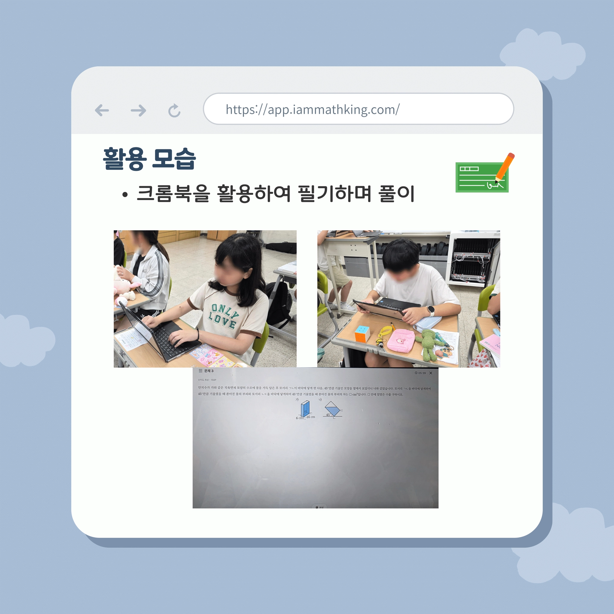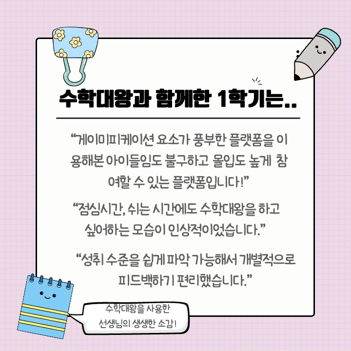 “수학(대왕)을 하고싶다는 말을 매일 같이 저에게 한다는 점입니다. 강제로 시키지 않아도 스스로 학습할 의욕이 생긴다는 점에서 정말 감동이었습니다.” - 부산 OO초 정OO쌤