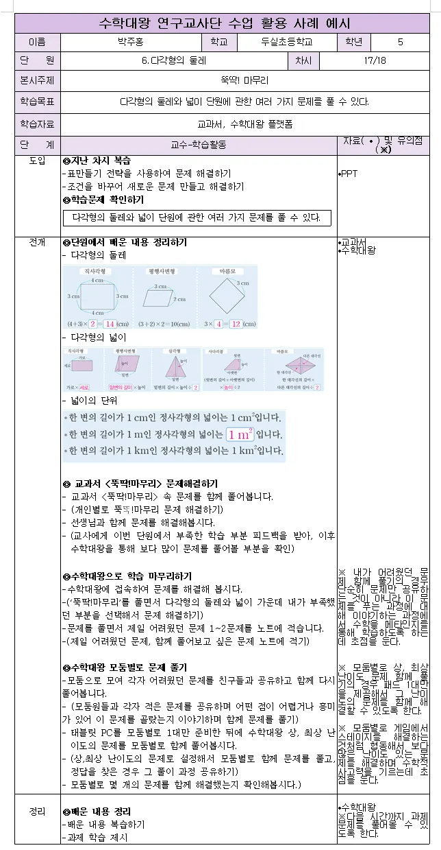 다각형의 둘레와 넓이 단원에 관한 여러 가지 문제를 풀 수 있다.