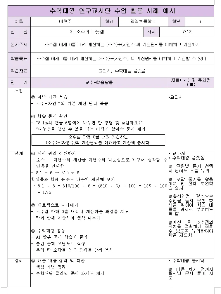 소수점 아래 0을 내려 계산하는 (소수)÷(자연수)의 계산원리를 이해하고 계산하기