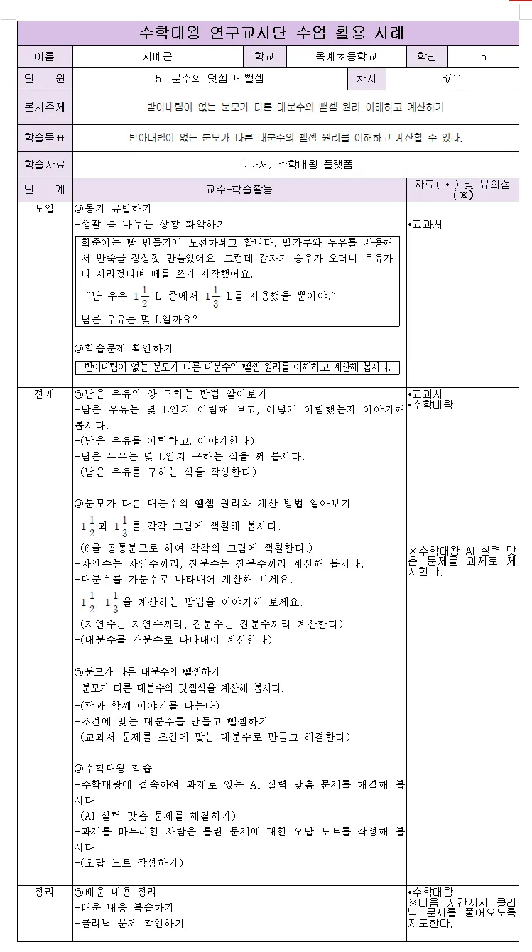 받아내림이 없는 분모가 다른 대분수의 뺄셈 원리 이해하고 계산하기
